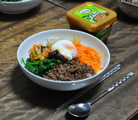 うちのビビンバ、野菜は薄めに味付けして豆板醤、コチュジャン、テンメンジャンを
