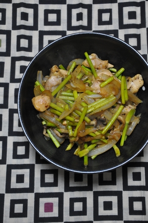 にんにくの芽、鶏もも、たまねぎ、しめじをごま油でいためて