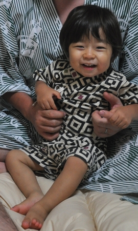 コタロウは女将さんにかわいがってもらってデレデレ。