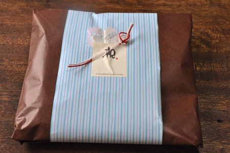 甚平とこれともっと初期の離乳食用の平べったいスプーンのセットでラッピングをお願いしました。