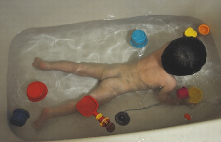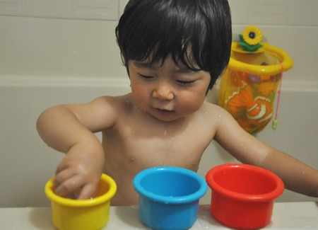 コップ重ね、気に入ってあそんでる。しめしめ。 水をすくうけど 穴から出ちゃうので不思議がってた。
